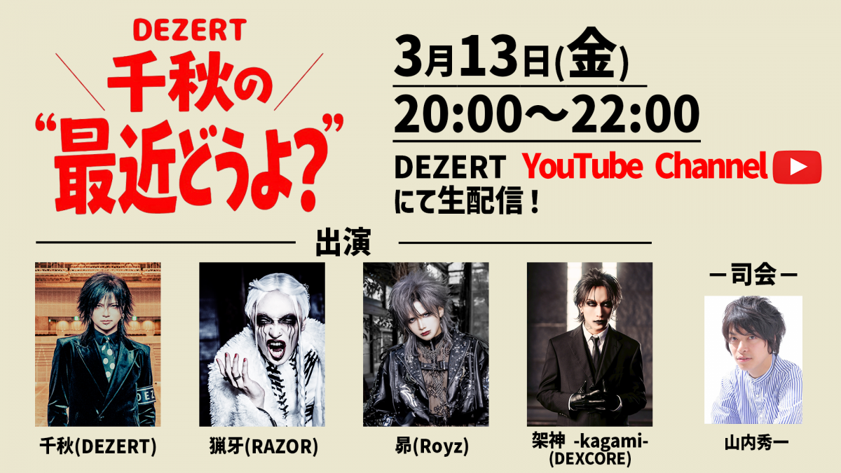 DEZERT 千秋の"最近どうよ?" #1(?)3/13(金) 20:00〜22:00DEZERT YouTube にて生配信🎬千秋がお酒を楽しみながらゲストと近況トークをする、大変ラフな配信番組🍶〈司会〉山内秀一〈出演〉千秋 (DEZERT)猟牙 (RAZOR)昴 (Royz)架神 -kagami- (DEXCORE)